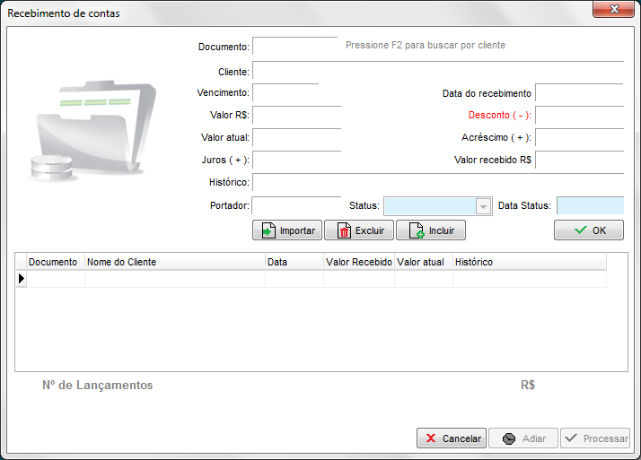 Selecione a conta que deseja receber e clique em F3 - OK. Se necessário incluir mais contas, pressione F2 novamente e pesquise a outra conta. Ao concluir o lançamento das contas que deseja receber, clique em OK e em seguida em Processar para finalizar o recebimento: