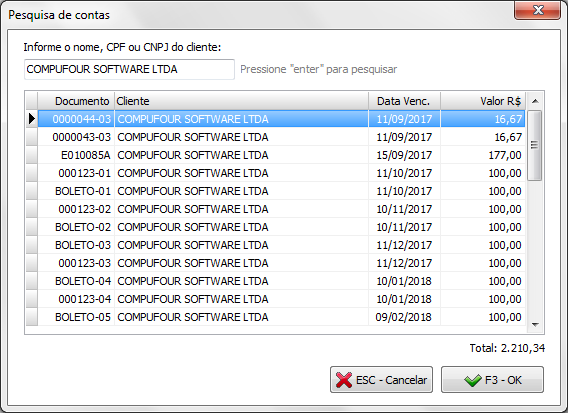 Ao informar o nome do cliente, CPF ou CNPJ serão listadas todas as contas do mesmo: