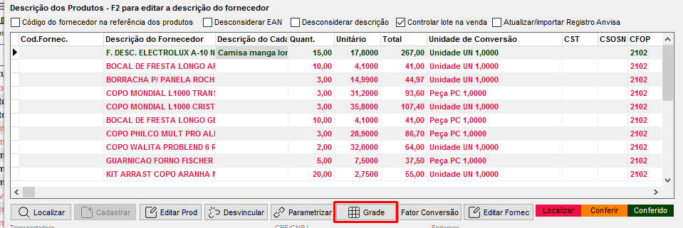 Caso esteja efetuando o lançamento da nota de compra através da importação de XML, ao localizar um produto com grade, será disponibilizado o botão Grade, que permitirá o lançamento correto das cores e tamanhos recebidos.