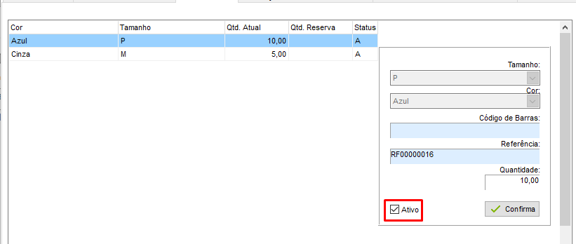 Preencha os dados, cor, tamanho e quantidade (obrigatoriamente deve inserir o Tamanho e a Cor, já a Quantidade poderá informar zero para posteriormente efetuar o lançamento através da nota de entrada) e clique no botão Confirma. É possível inativar o item da grade em questão, basta desmarcar o botão Ativo;