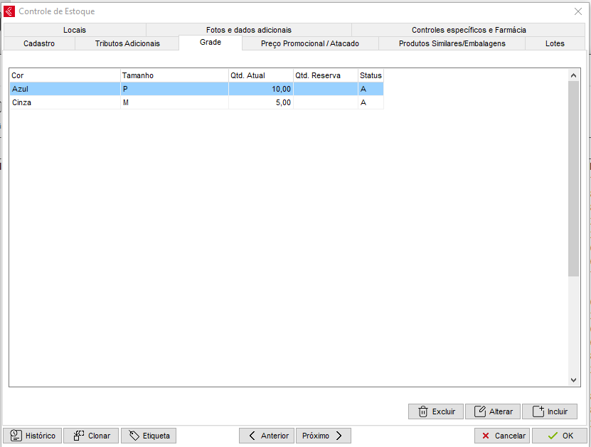 Acessando essa guia será possível cadastrar as quantidades dos produtos e suas respectivas grades.