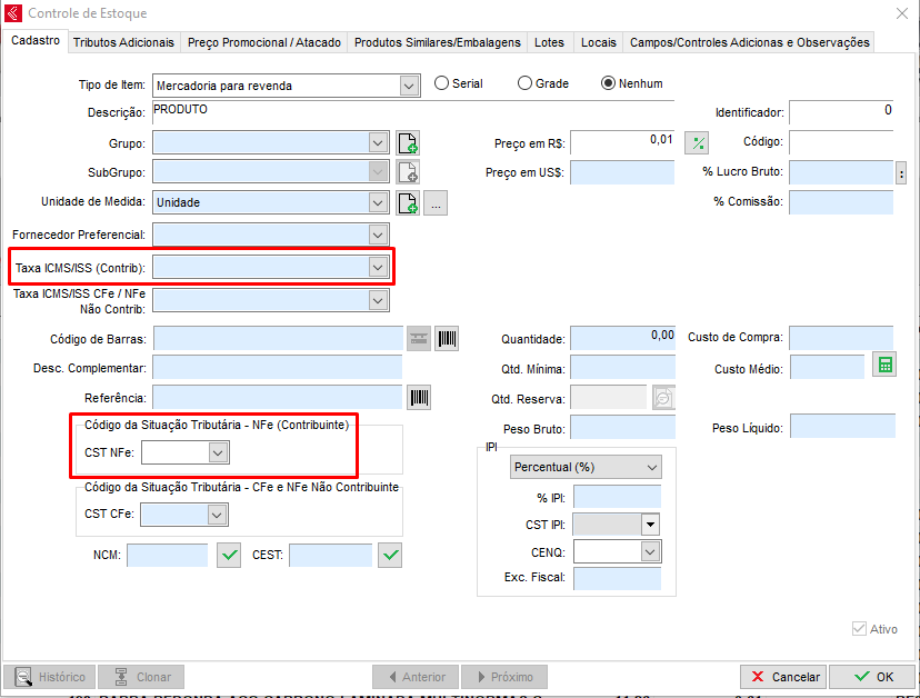 Para Notas Fiscais Eletrônicas, quando for apresentada essa mensagem, abra seu Clipp Pro, acesse o módulo de Estoque e abra o cadastro do produto que foi lançado na nota. Neste momento, verifique se o campo CST NFe encontra-se preenchido conforme a orientação do seu contador, também confira se o campo Taxa ICMS/ISS (Contrib) encontra-se preenchido ou em branco.