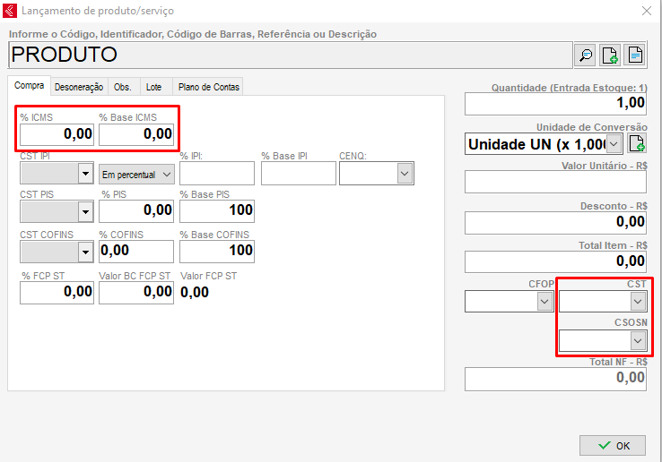 Os campos % ICMS e % Base ICMS devem estar zerados caso não deva calcular o ICMS. Caso seja necessário calcular o ICMS, ambos os campos devem estar preenchidos com valores acima de zero (em caso de dúvidas consulte o seu contador). Referente ao CST e ao CSOSN (o CSOSN somente é utilizado por empresas Optantes do Simples Nacional), verifique com seu contador os códigos compatíveis com a operação descrita acima (para o cálculo do ICMS ou não).