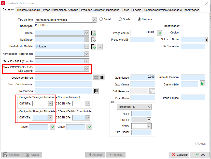 Para Notas Fiscais do Consumidor Eletrônicas, quando for apresentada essa mensagem, abra seu Clipp Pro, acesse o módulo de Estoque e abra o cadastro do produto que foi lançado na venda. Neste momento, verifique se o campo CST CFe (para verificar a relação de CST aceitos pela NFC-e clique aqui) encontra-se preenchido conforme a orientação do seu contabilista, também confira se o campo Taxa ICMS/ISS CFe/NFe Não Contrib. encontra-se preenchido ou em branco.