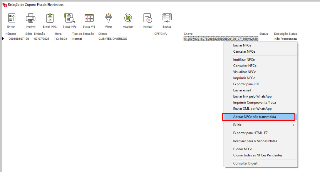 - Abra o seu Emissor de NFC-e, acesse as Vendas Emitidas (F7), clique com o botão direito do mouse sobre a venda em questão e selecione Alterar NFC-e Não Transmitida;