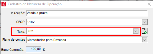 - Localize o CFOP 5102 - Venda à vista, clique sobre o mesmo e verifique o que está preenchido no campo Taxa, identificando essa informação, feche o cadastro;