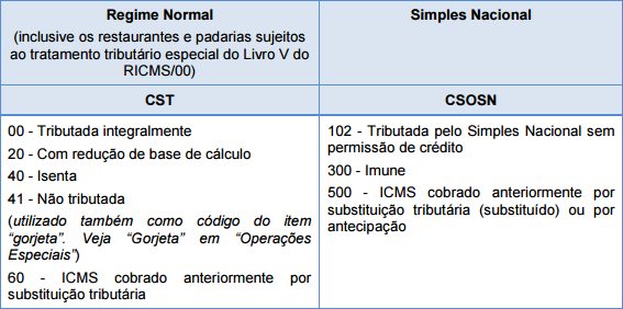 Relação de CST/CSOSN aceitos pela NFC-e|