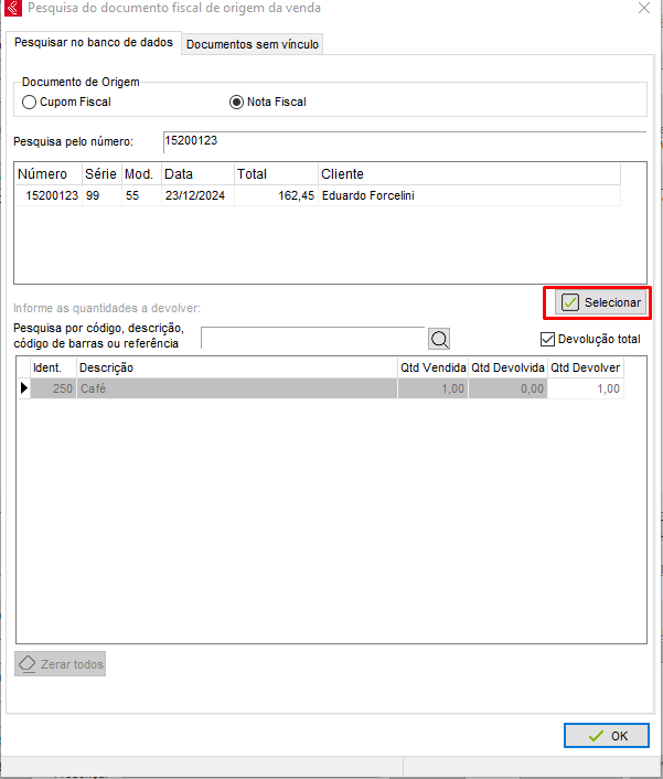 7. Em seguida, informe o número do documento a ser devolvido e pressione Enter para que seja apresentada a nota. Feito isso, clique sobre a nota em questão e clique no botão Selecionar para informar as quantidades dos produtos que serão devolvidos: