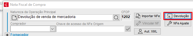 5. Após informar o CFOP correto, clique no botão Devolução: