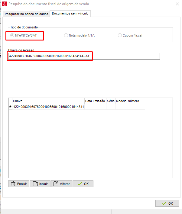 - Marcando o tipo de documento "NFe/NFC-e/SAT" será necessário informar a chave de acesso do documento pressionar Enter e clicar em OK para confirmar: