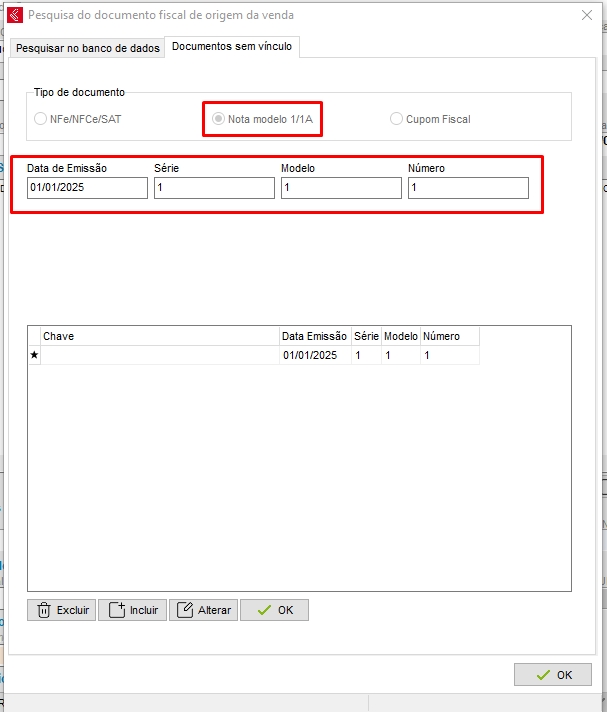 - Marcando o tipo de documento "Nota modelo 1/1A" será necessário informar a data de emissão, série, modelo e número. Em seguida, pressione Enter e clique em OK para confirmar: