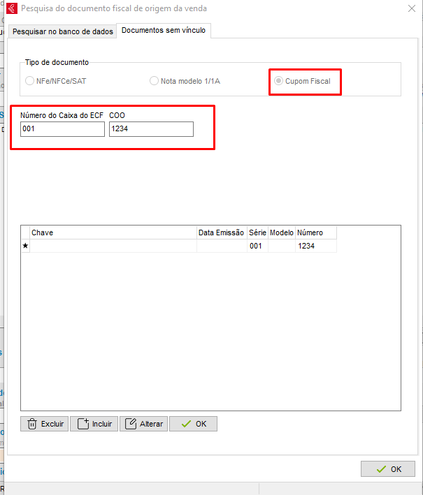 - Marcando o tipo de documento "Cupom Fiscal" será necessário informar o COO (número de identificação do Cupom Fiscal) e caso queira o número do caixa em que o mesmo foi emitido. Feito isso, pressione Enter e clique em OK para confirmar: