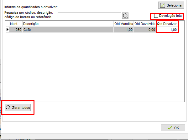 Caso seja uma Devolução Parcial, depois de selecionar o documento de origem, é possível informar as quantidades a serem devolvidas para os casos de uma devolução de forma parcial. Para informar a quantidade, desmarque a opção Devolução total, clique no botão Zerar todos e então digite a quantidade dos itens que serão devolvidos no campo Qtd. Devolver.