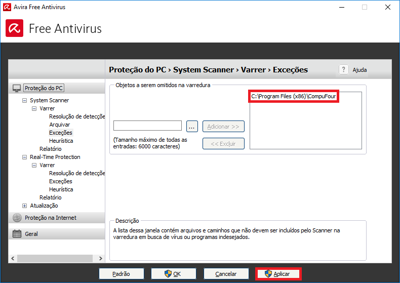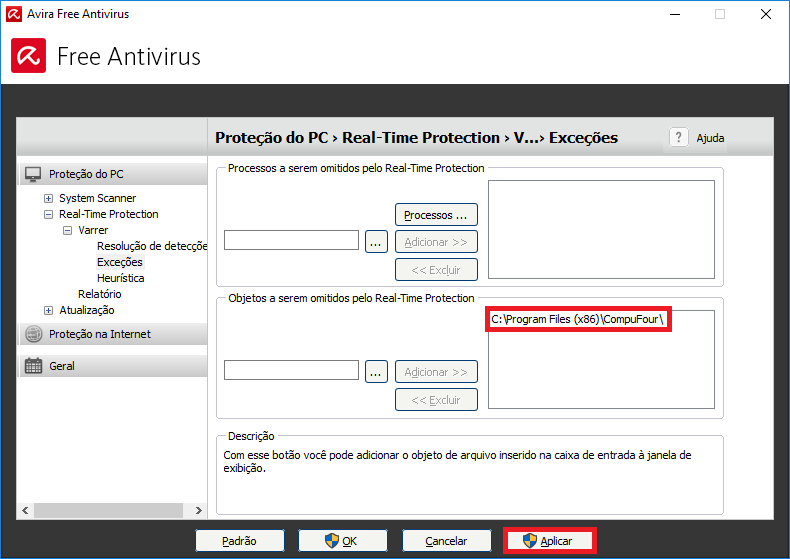 - Por fim, clique em Aplicar para salvar as alterações. Desta forma, o Clipp Pro e o Firebird estarão nas exceções do Avira;