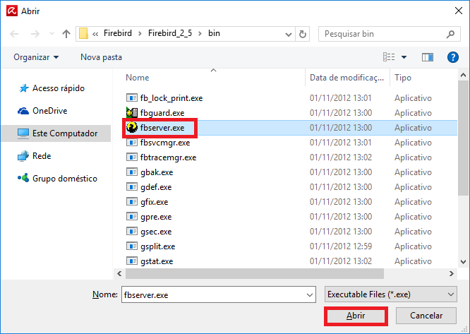 - Neste momento, defina o executável do Firebird (caminho padrão: C:\Arquivos de Programas\Firebird\Firebird_2_5\bin) e clique em Abrir;