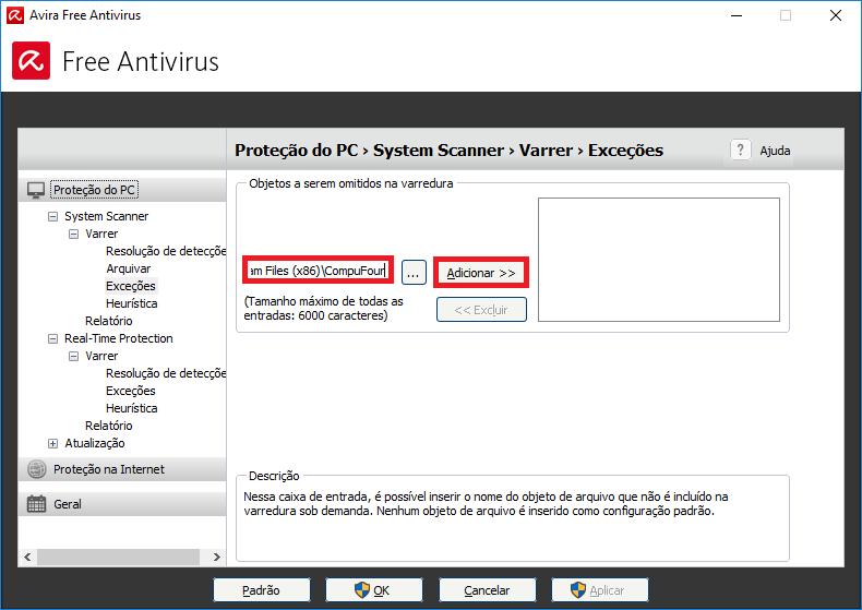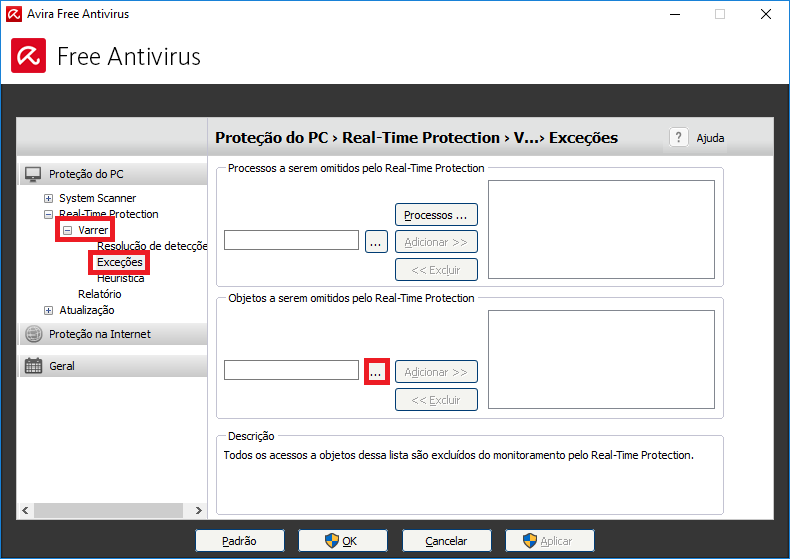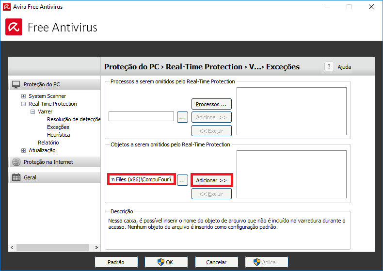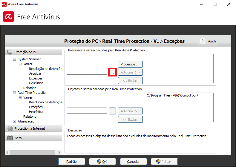 Habilitar exceções – Avira no Clipp Pro