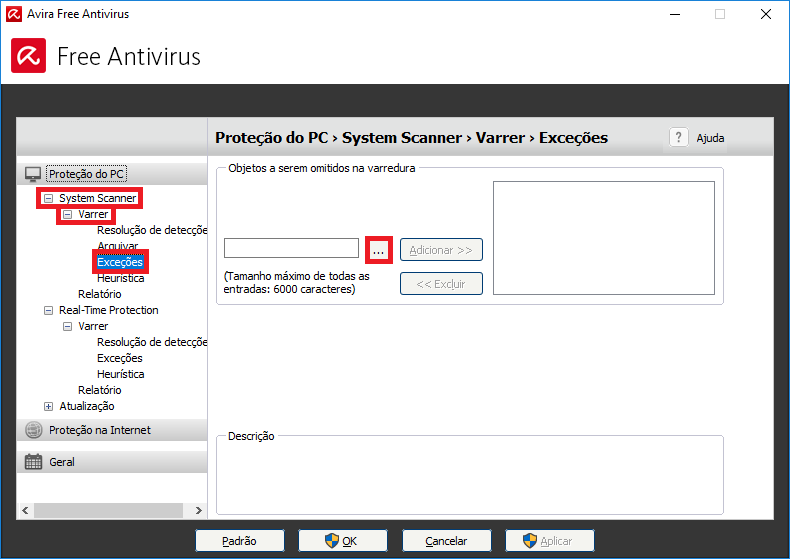 - Agora acesse a guia System Scanner, abra a opção Varrer e clique em Exceções. Novamente clique na opção para localizar;