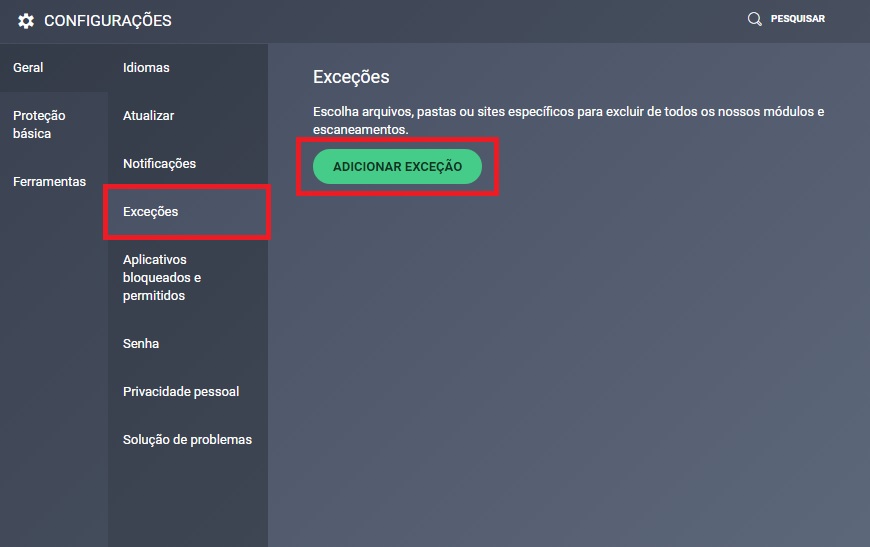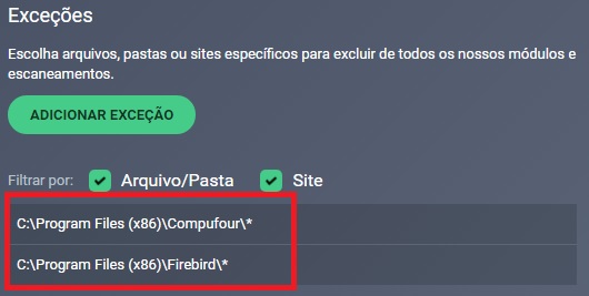 Dentro da interface do antivírus precisará efetuar a configuração de Exceções. Esta ferramenta permite deixar uma pasta fora do escaneamento dos módulos de proteção do AVG, neste caso, precisaremos incluir a pasta Zucchetti e a pasta Firebird as exceções do antivírus.