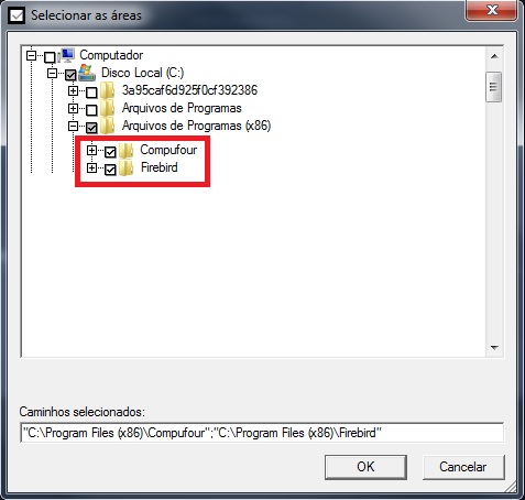 Localize em seu computador a pasta Zucchetti onde o sistema está instalado, marque o quadro em branco ao lado do nome da pasta e em seguida faça o mesmo procedimento com a pasta Firebird. Feito isso, clique em OK.