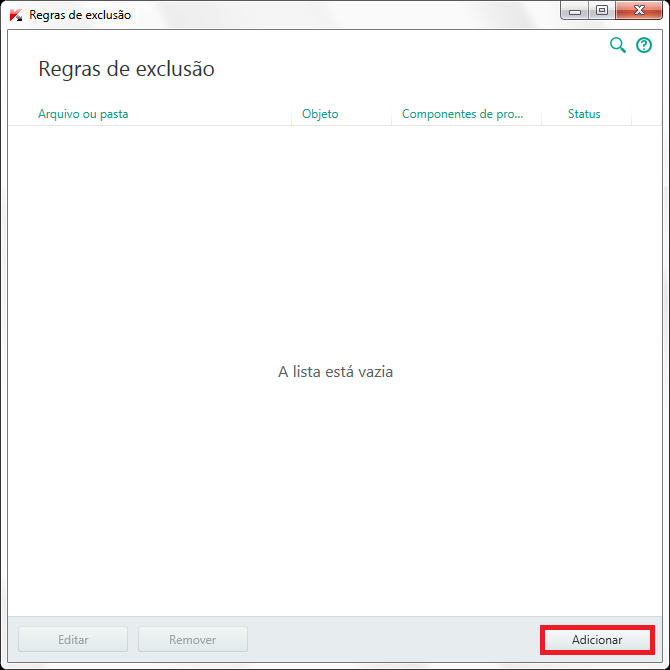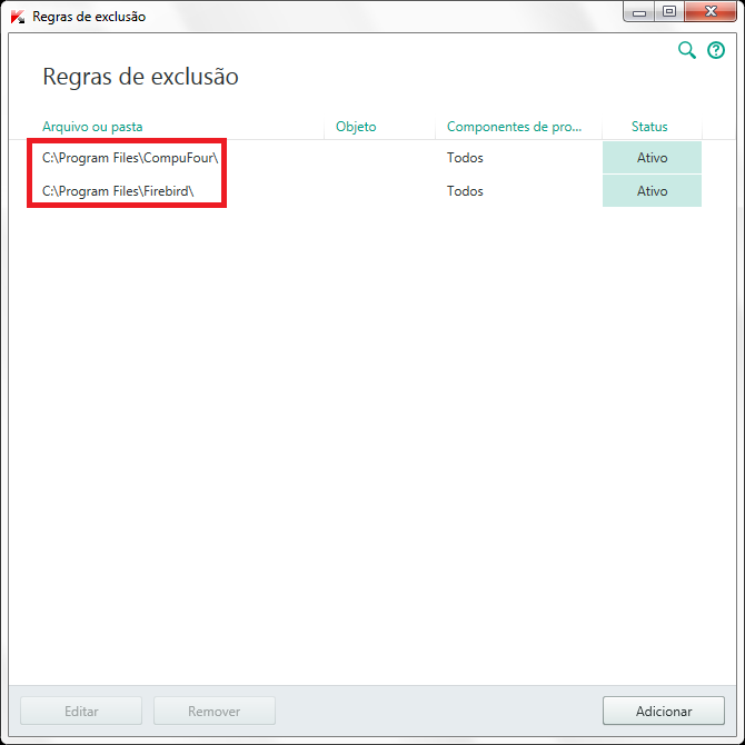 Dentro da interface do antivírus precisará efetuar a configuração de Exclusões. Esta ferramenta permite deixar uma pasta fora do escaneamento dos módulos de proteção do Kaspersky, neste caso, precisaremos incluir a pasta Zucchetti e a pasta Firebird às exceções do antivírus.