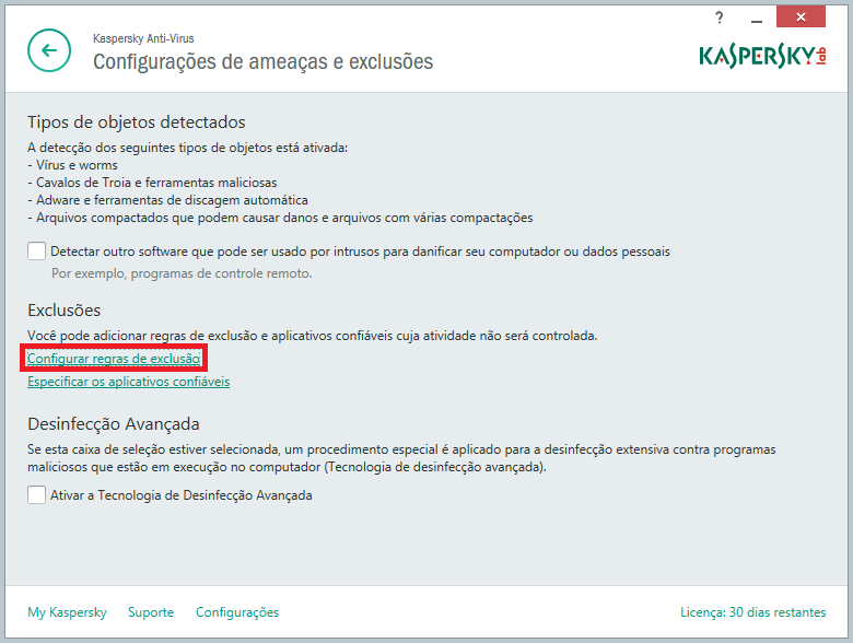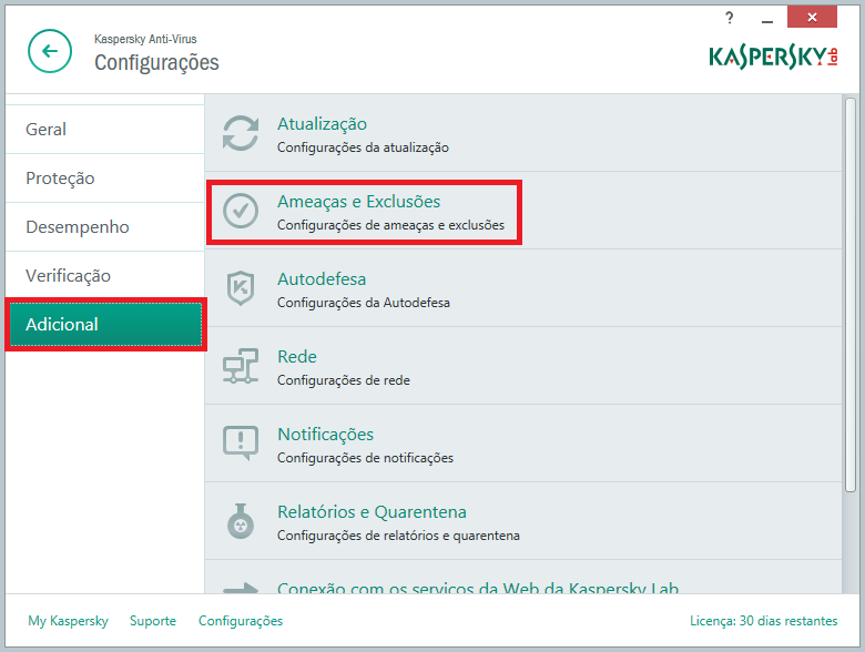 É válido lembrar que dependendo da versão instalada do Kaspersky o local da configuração pode ser diferente e neste caso deverá solicitar o auxilio de um técnico especializado.