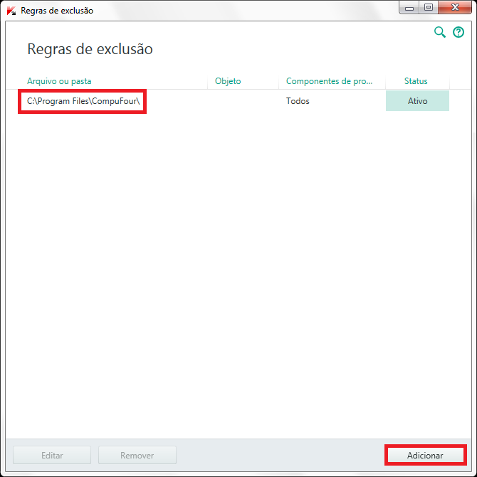 Na opção de Arquivo ou pasta, clique em Procurar e localize a pasta de instalação do programa chamada Zucchetti (caminho padrão: C:\Arquivos de Programas\CompuFour). Sem desmarcar nenhuma das opções abaixo, clique em Adicionar para salvar a pasta;
