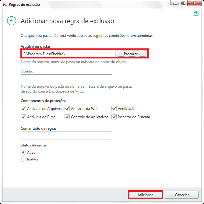 Agora na opção Arquivo ou pasta, procure pela pasta Firebird (caminho padrão: C:\Arquivos de Programas\Firebird). Novamente sem desmarcar nenhuma das opções abaixo, clique em Adicionar para salvar também esta pasta;