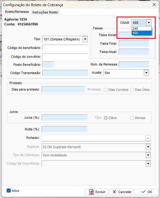 Temos duas opções de CNAB, o 240 e o 400. Para alterar, basta acessar a configuração da carteira do boleto de cobrança indo até Arquivo - Configuração de Boleto de Cobrança - Selecione a carteira ECR, no canto superior direito, você encontrará a opção para alterar o CNAB.
