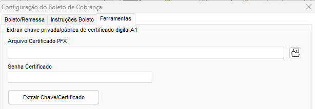 Na aba Ferramentas, você ira gerar dois arquivos o SicoobChavePrivada.key e SicoobCertificado.pem, que são necessários para finalizar a configuração do boleto via API.
