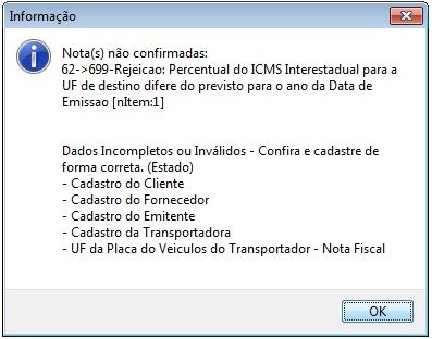 Rejeição 699 - Percentual do ICMS Interestadual para a UF de destino difere do p
