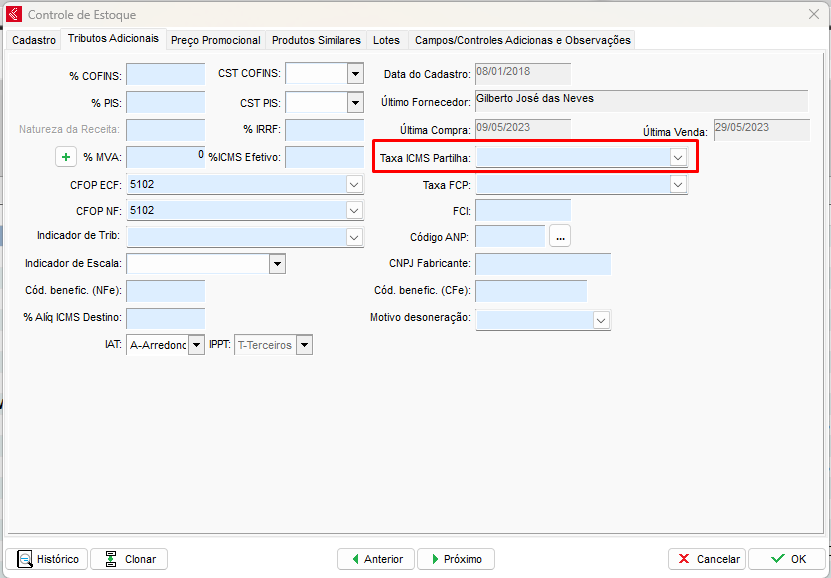 Com o cadastro do item aberto, vá até a aba Tributos adicionais, nela encontre o campo Taxa ICMS Partilha, se tiver alguma taxa preenchida, remova a mesma.