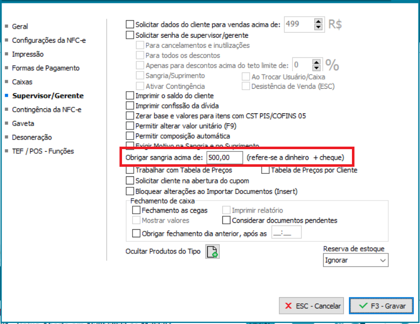 É possível obrigar o seu caixa a efetuar uma sangria ao efetuar as vendas acima de determinado valor, considera-se dinheiro e cheque.