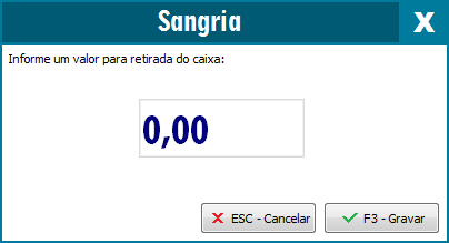 Clique sobre Sangria ou Suprimento conforme sua necessidade, posteriormente será aberta uma janela solicitando o valor para tal operação.