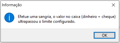Então, se ultrapassar o valor definido durante uma venda, irá apresentar a mensagem abaixo e irá obrigar a efetuar uma sangria.